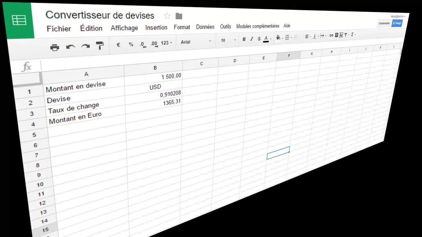 Dans une cellule de votre feuille de calcul Google Docs vous pouvez utiliser la fonction GoogleFinance() pour importer automatiquement le dernier taux de change. Vos calculs seront toujours à jour sans avoir à perpétuellement rechercher un taux de change en fonction de la date pour laquelle vous avez besoin d’une situation.